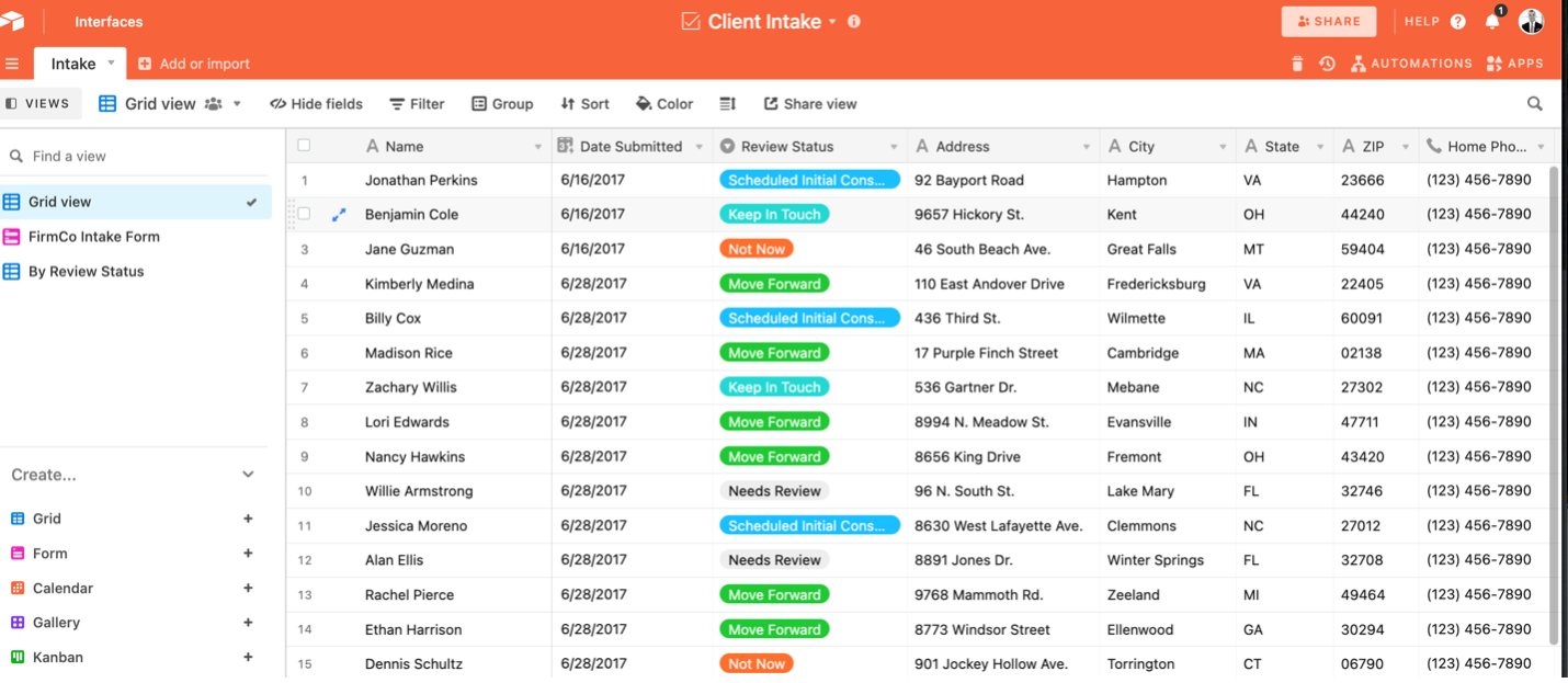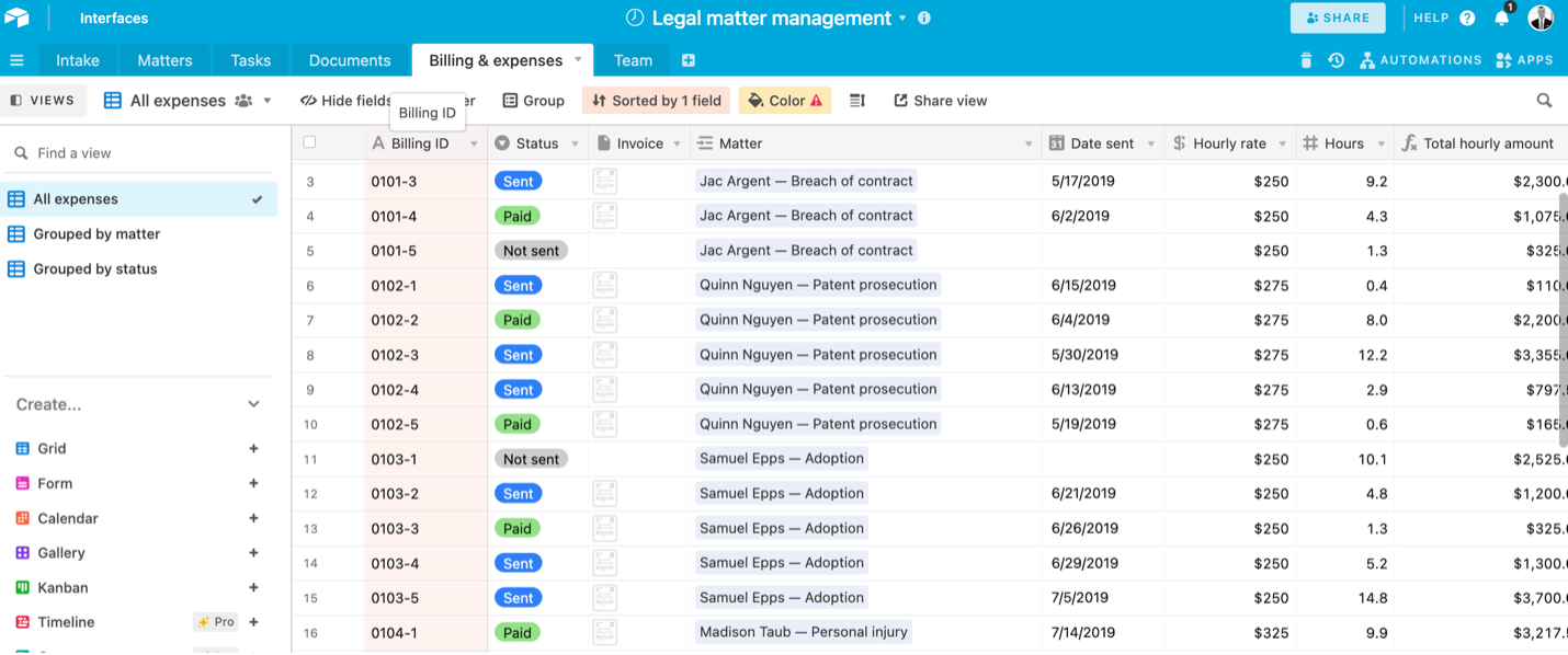 With Airtable, you can be very creative and create a case management system, a legal case analysis database, an intake database with an intake form, or a contract management system. All you need is a little bit of time and creativity to build powerful and dynamic apps.